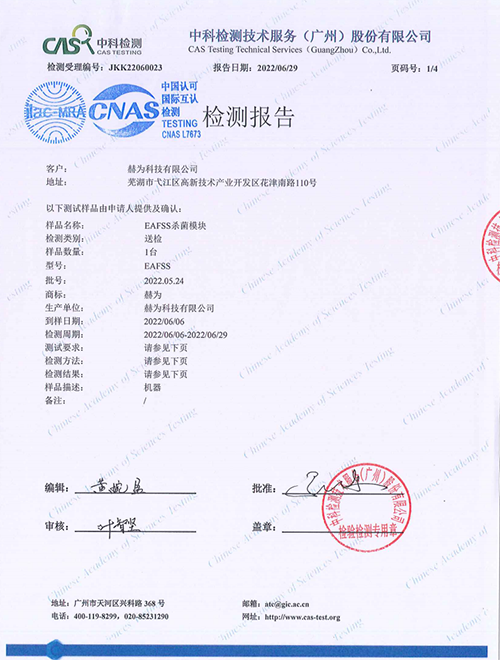 今日,赫為EAFSS殺菌技術通過中科檢測技術服務(廣州)股份有限公司的冠狀病毒HCoV-229E的檢測,檢測報告顯示,赫為EAFSS殺菌模塊對冠狀病毒的清除率為99.99%!